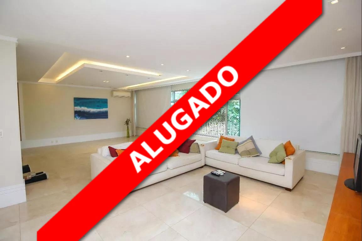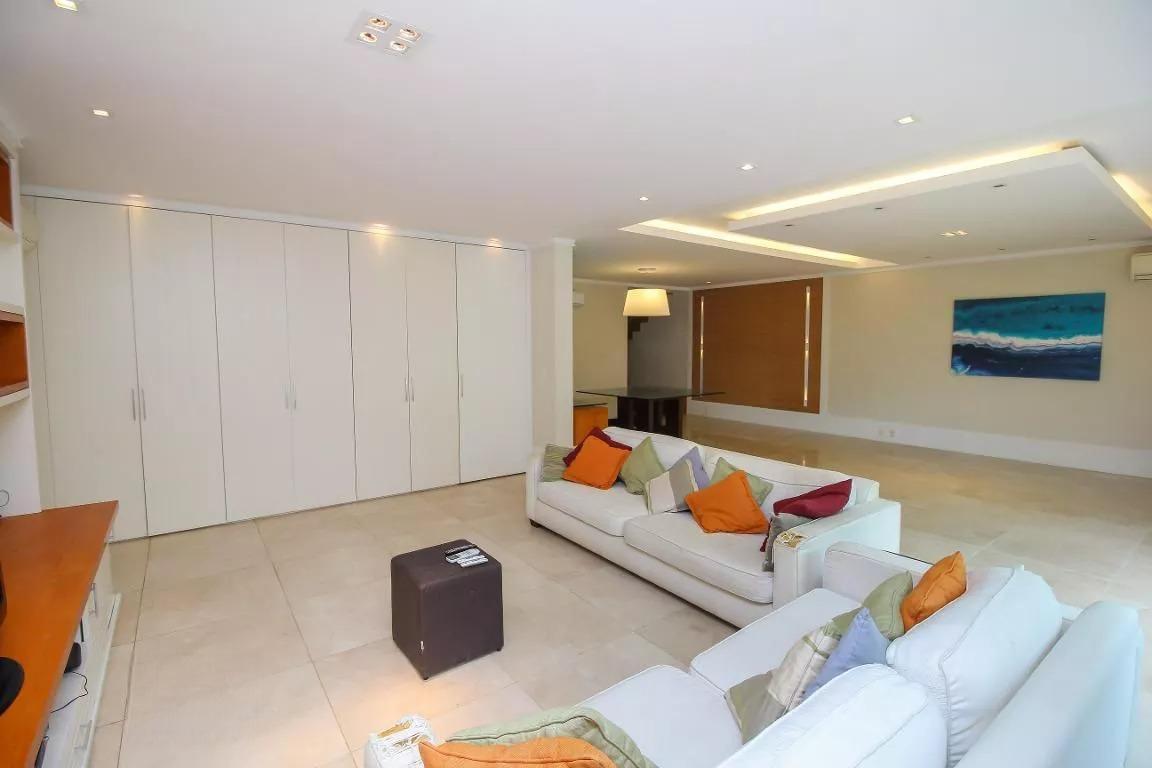 LEBLON QUADRÍSSIMA PRAIA!! Aristides Espínola. Excelente Triplex com 330m2, totalmente reformada, originalmente 4 quartos, transformada em 3 quartos, sendo 2 suítes, toda equipada com ar condicionado em todos os cômodos (inclusive cozinha), marcenaria planejada e portas blindadas (principal e acesso ao terraço). 1 Andar: Amplo salão em L com grandes janelas com vista pras copas das árvores, 3 quartos, sendo 2 suítes com closets, banheiro social, lavabo, cozinha grande, dependência completa de empregada e área de serviço (planta circular); 2 Andar (acesso por escada linear): Amplo salão, com janelas grandes, sala de TV, escritório e lavabo; Terraço (acesso por escada linear): Terraço com churrasqueira, sauna, piscina, chuveiro, lavabo e vista para o mar. Prédio aconchegante, bem administrado, com acessibilidade, portaria 24hrs e com 1 vaga na escritura + uma na convenção